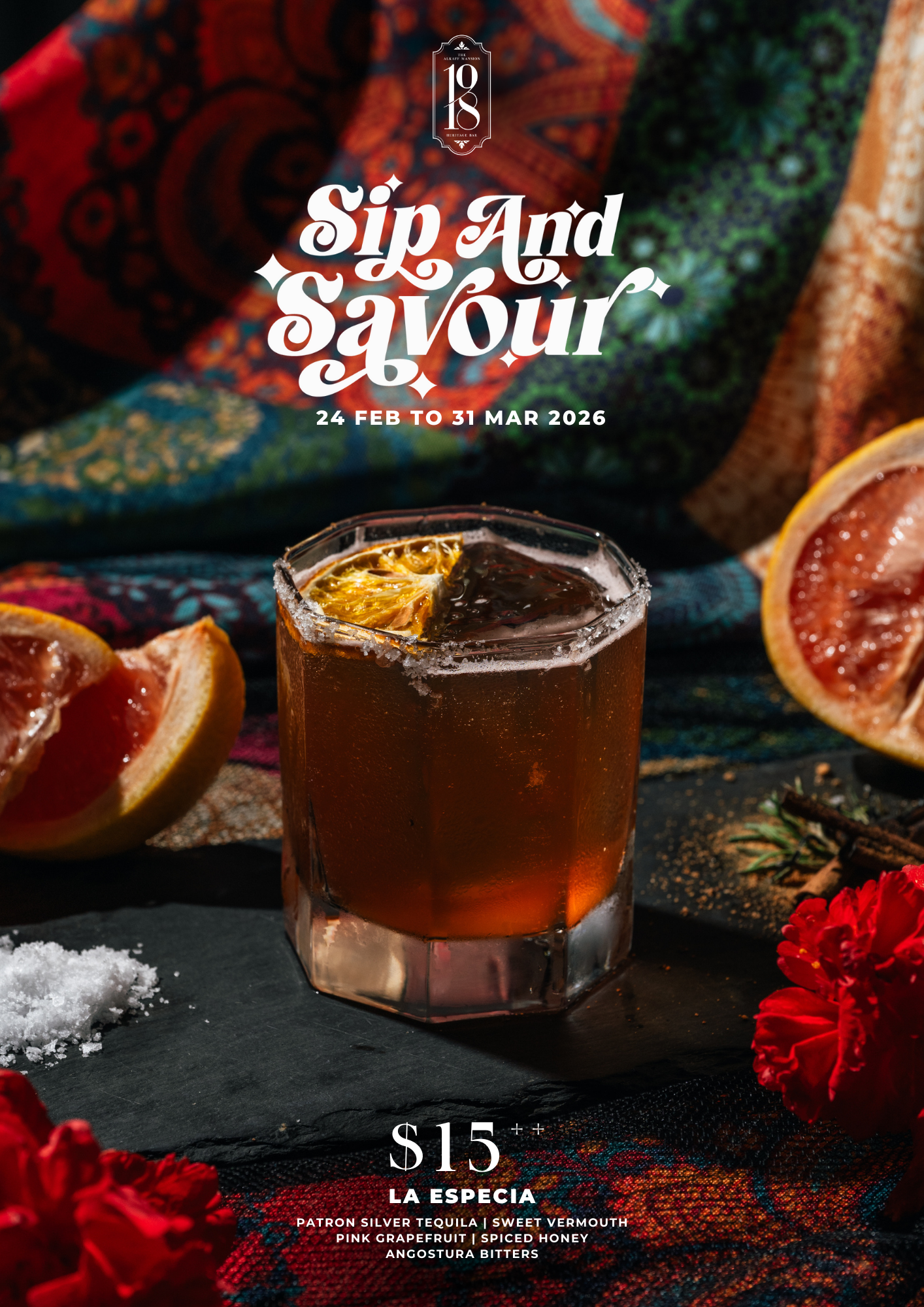 Step into the best heritage bar in Singapore, nestled atop a hill that pays homage to the year the mansion was built, 1918 Heritage Bar revolves around the rich heritage and culture of the establishment while grounded in the comfort of familiar flavours and spices traded by the Alkaff family.